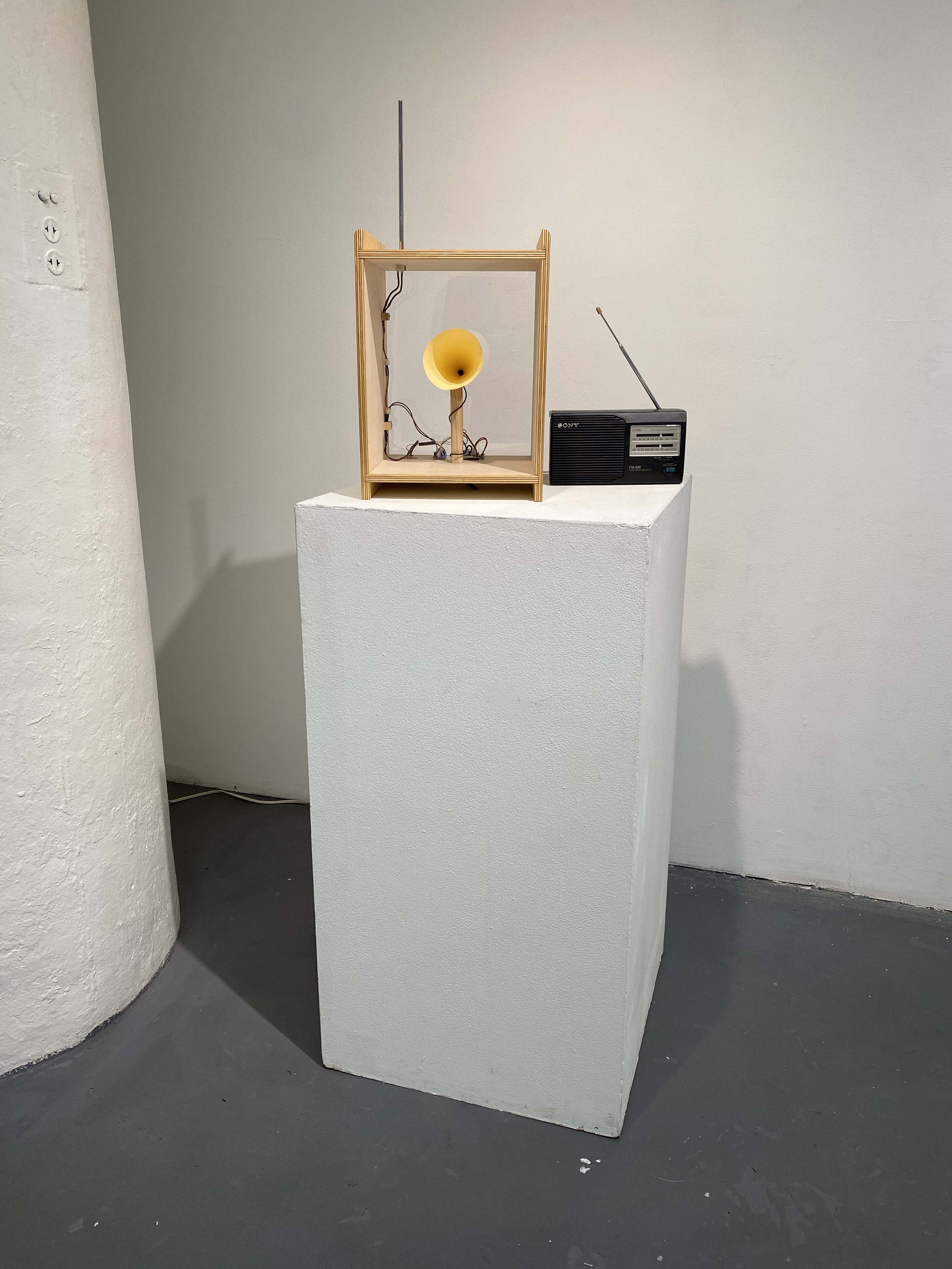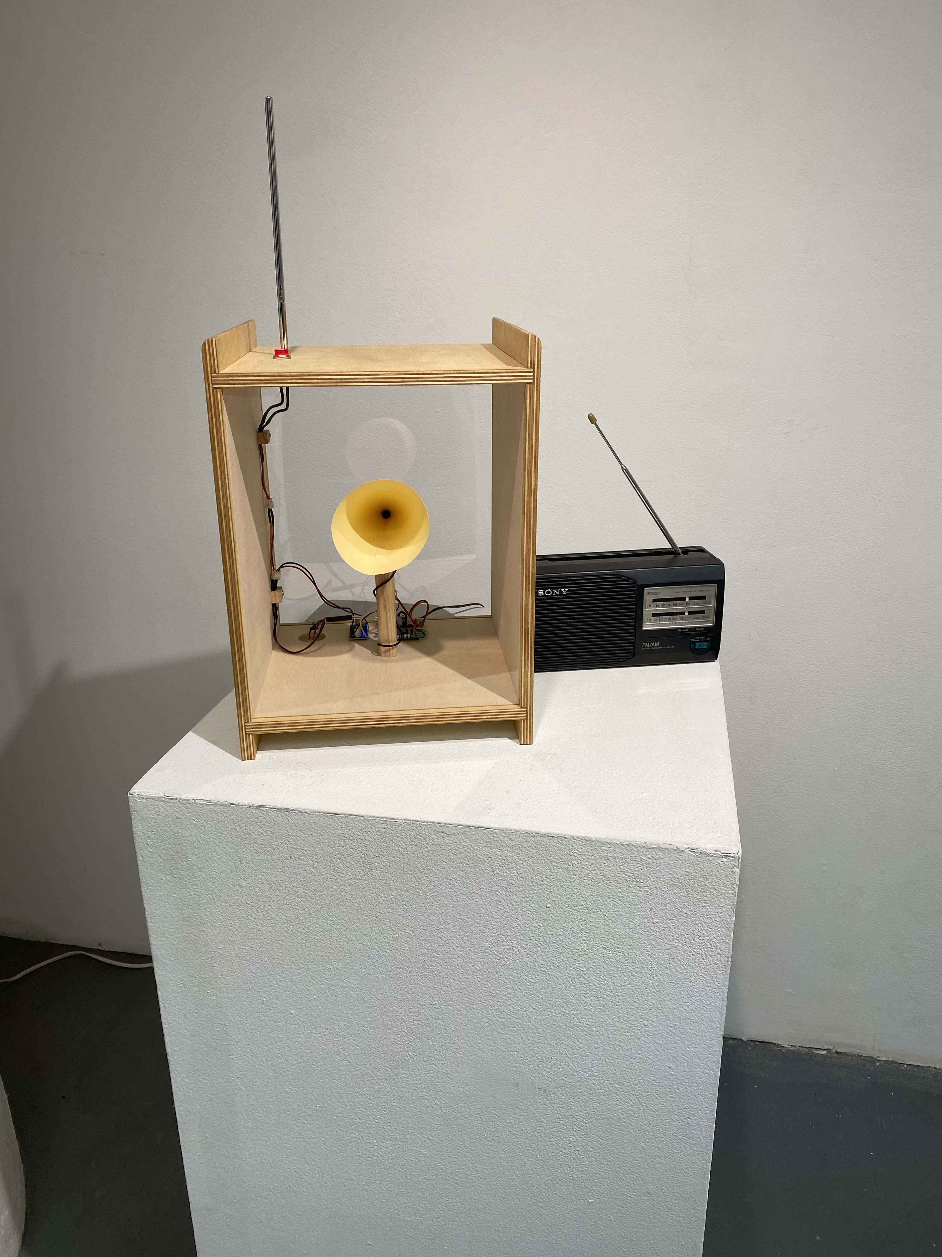 This device broadcasts the "sound" within itslef (presumably silence) over FM radio. You can "tune into" last Fluesday on 94.7 FM if you're in close proximity.