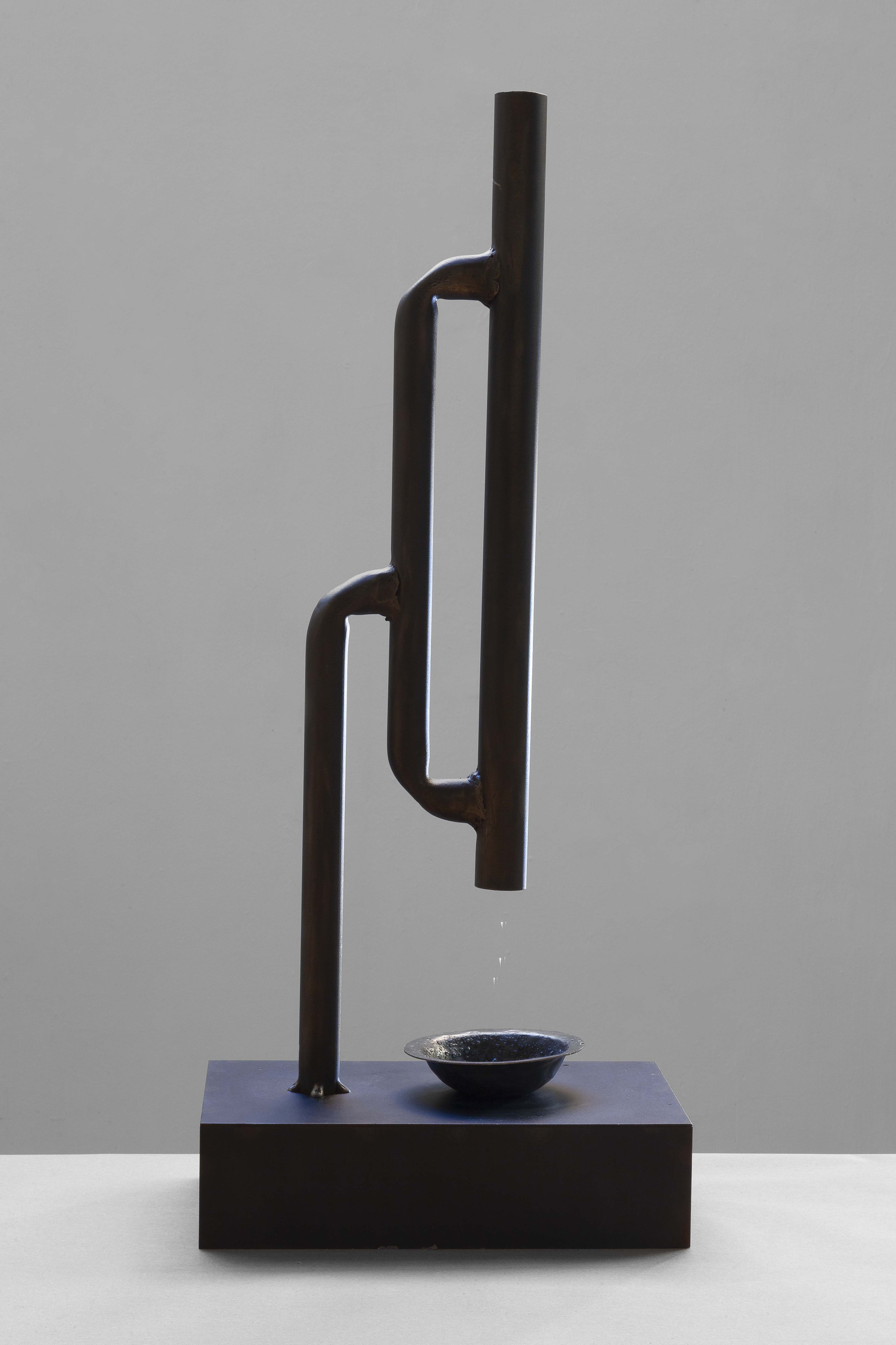 This is a slow-dripping, all metal fountain. The water drips out of the suspended vertical tube, and is collected in the below bowl to be recirculated. It uses a peristaltic pump attached to an adjustable power supply, which allows the pump's speed to be changed.