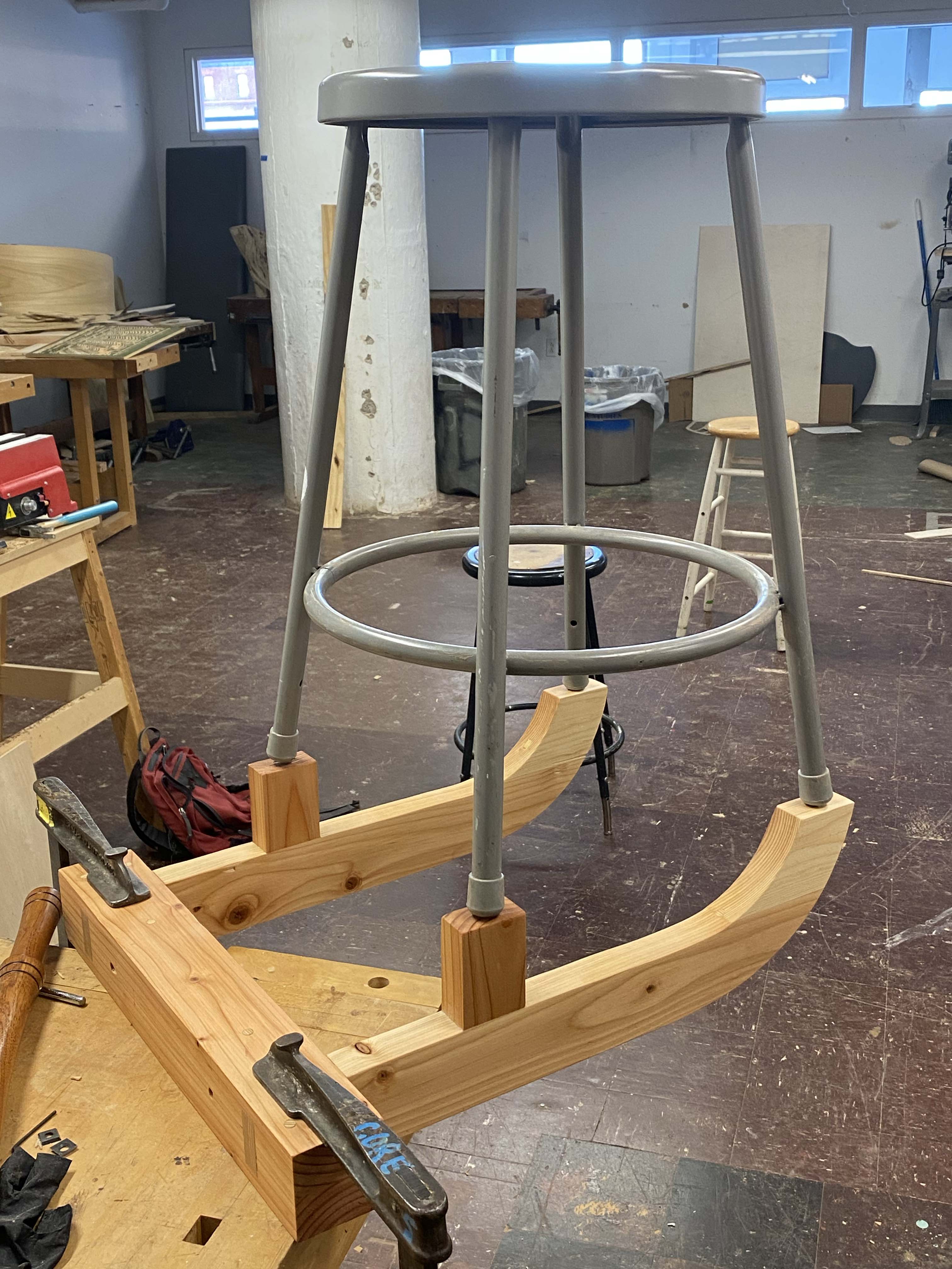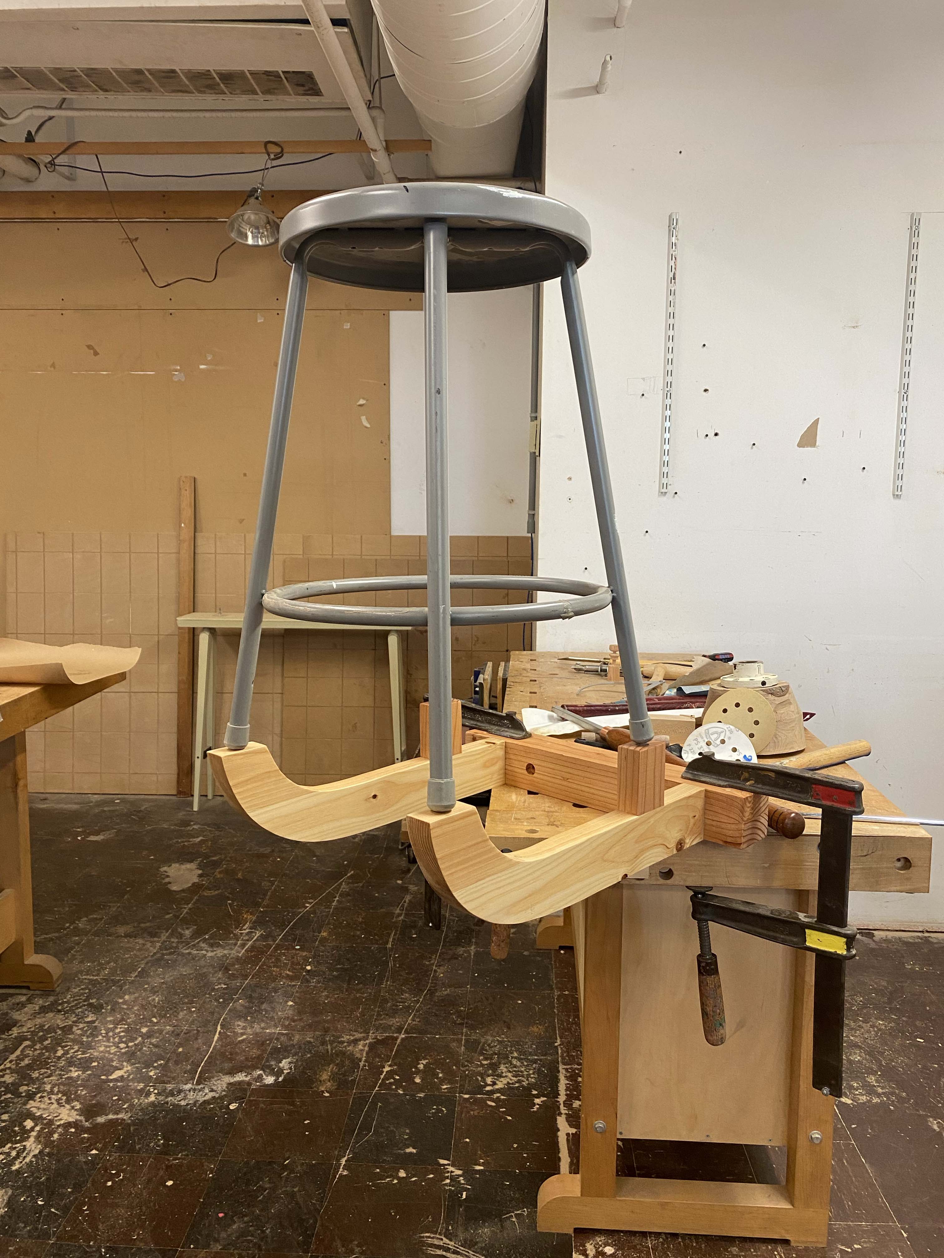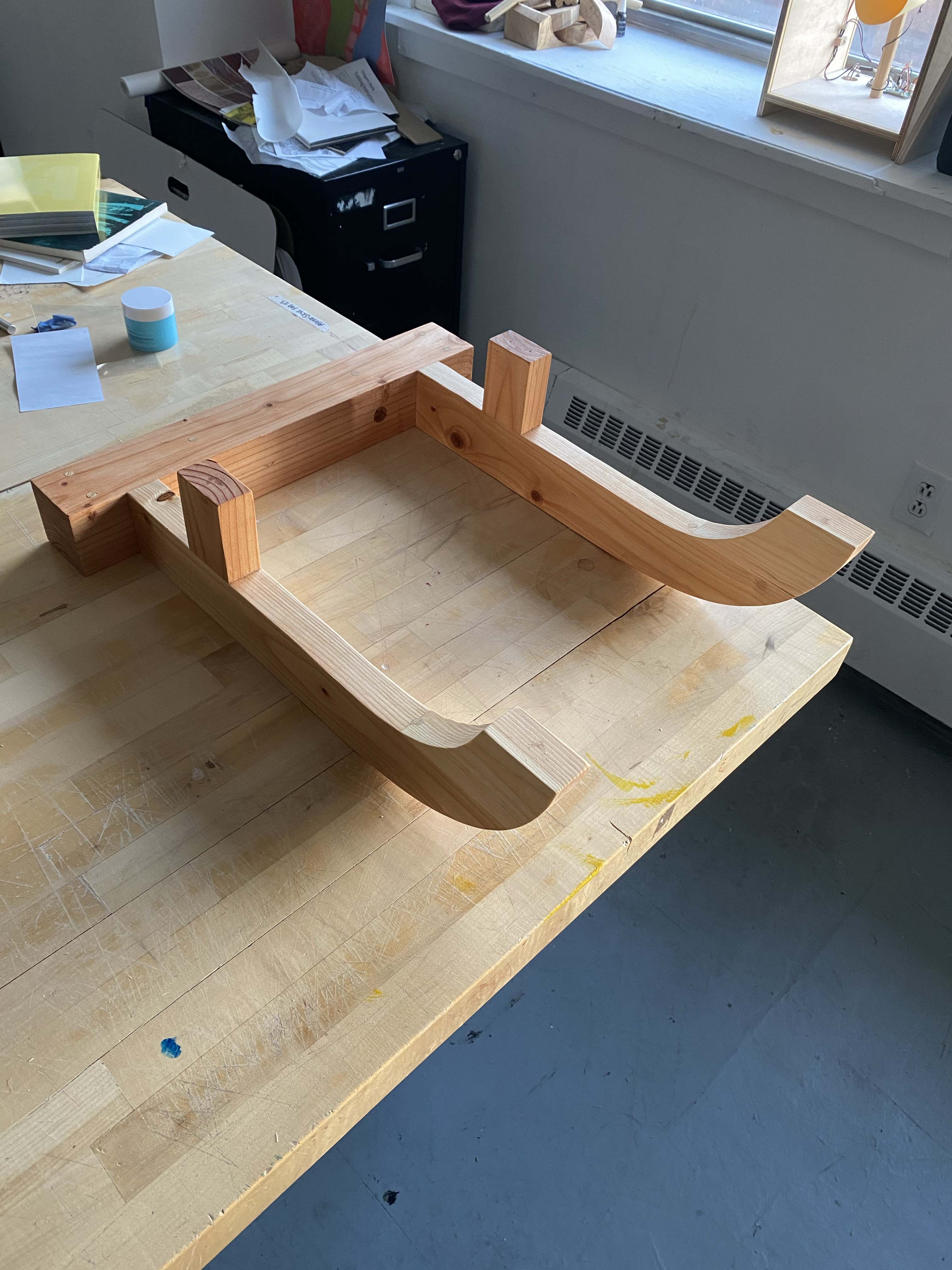 Description: This wood piece is designed to mount to a wall, specifically to support a standard four-legged studio stool. It's made of construction-grade pine, assembled with wood glue, dowels, and mortise and tenons.